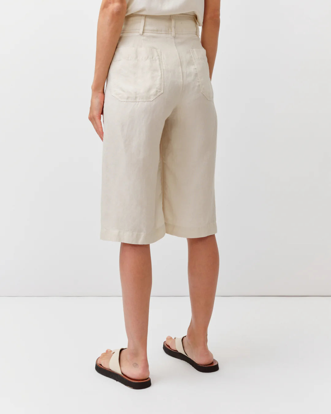 Bermuda à la coupe droite et longueur genou. Taille structurée avec large ceinture à passants et double bouton apparent. Grandes poches plaquées sur le devant et braguette zippée. Ligne nette et moderne pour une allure décontractée et équilibrée.