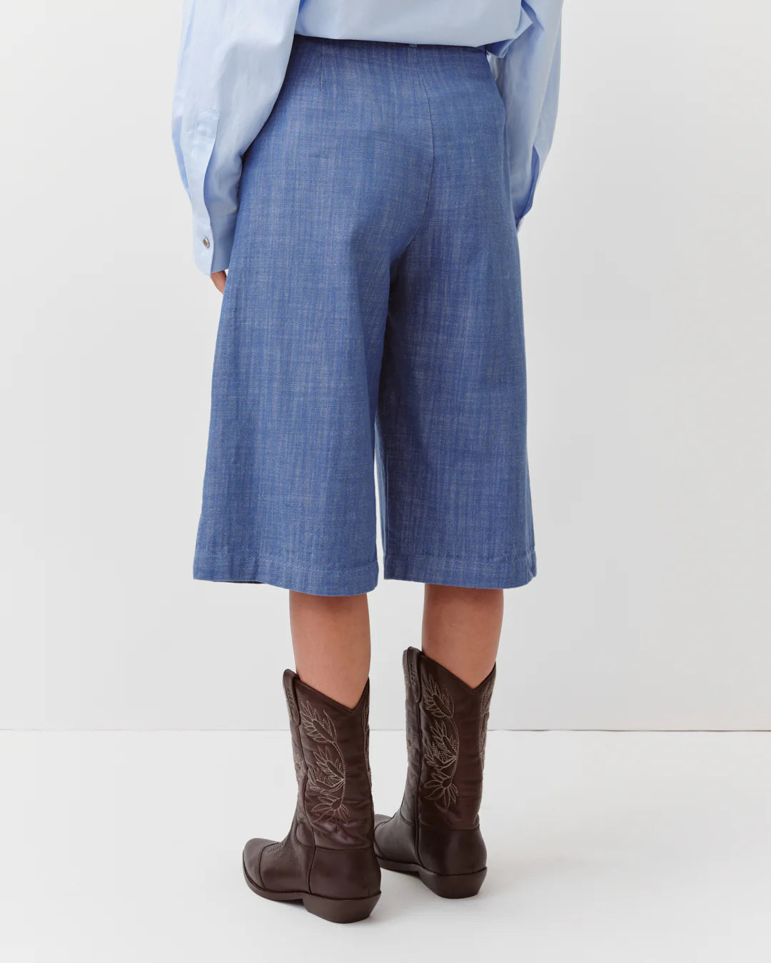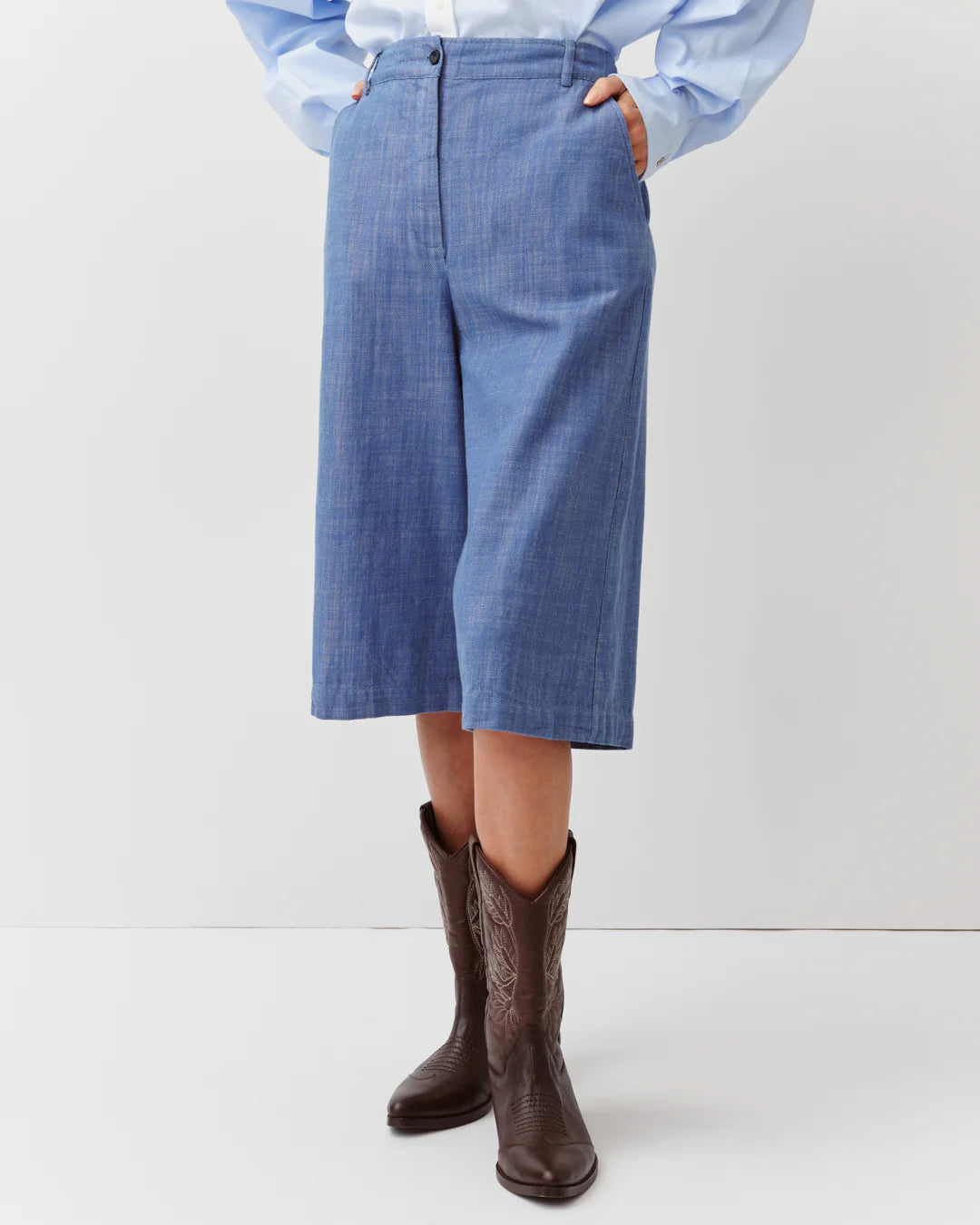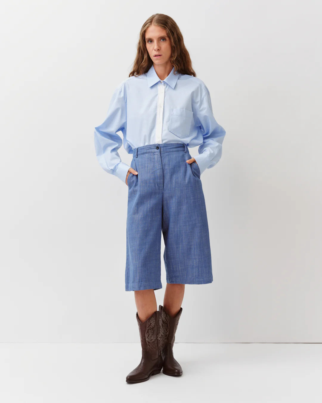 Bermuda à la coupe droite et longueur genou. Taille structurée avec passants et fermeture par bouton et zip. Deux poches italiennes à l’avant et pinces discrètes pour une ligne nette et équilibrée.