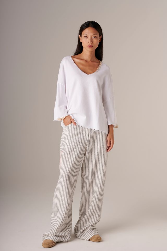 Profitez du confort estival avec le pantalon Stripe en blanc. Confectionné dans un lin 100 % haut de gamme, il offre une sensation agréable de légèreté et laisse votre peau respirer. Son design ample à rayures apporte une touche fraîche et décontractée à toutes vos tenues, idéale pour les journées chaudes.
