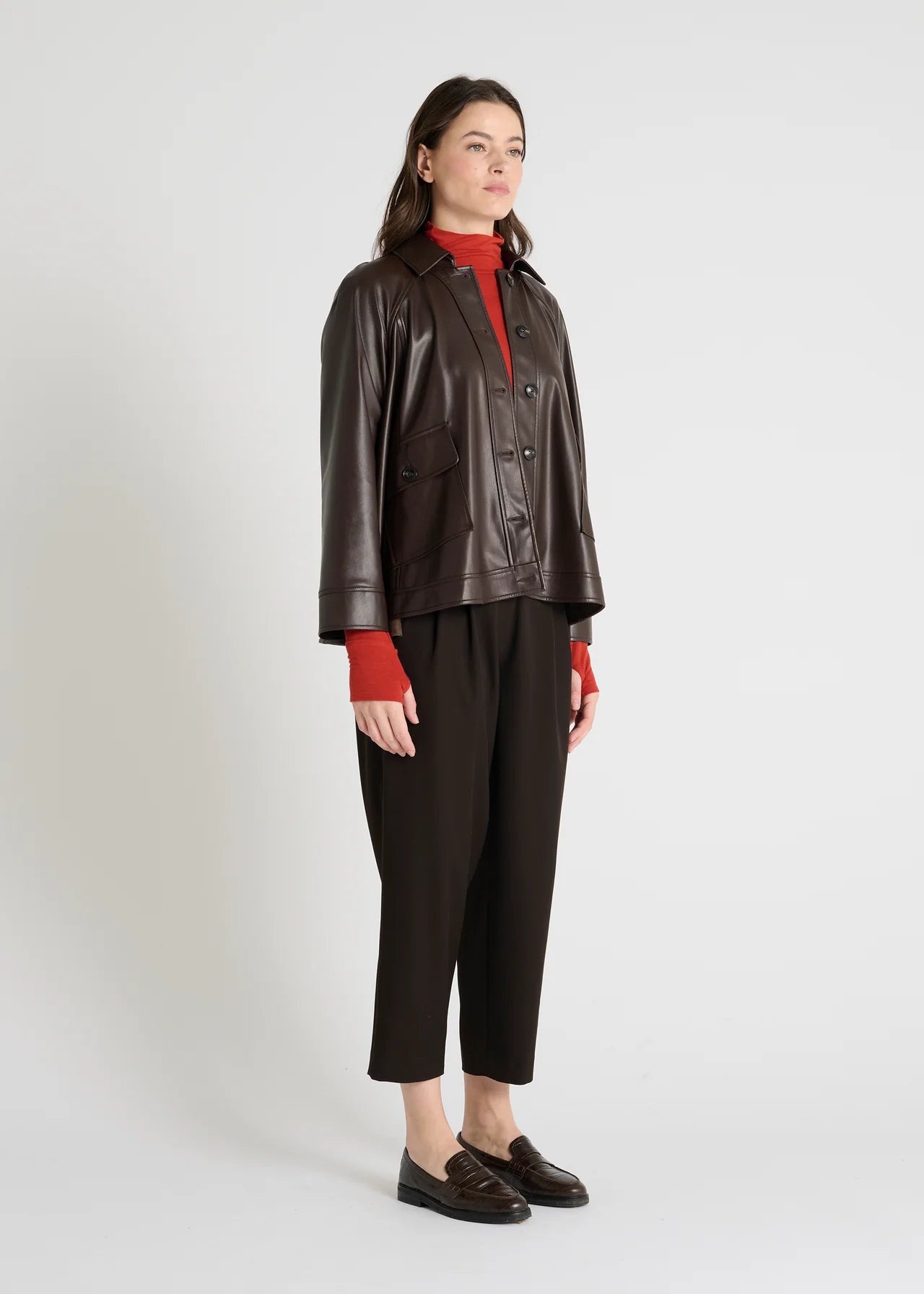 La veste Rumi se distingue par sa forme loose et son col fermé par quatre boutons en corozo.